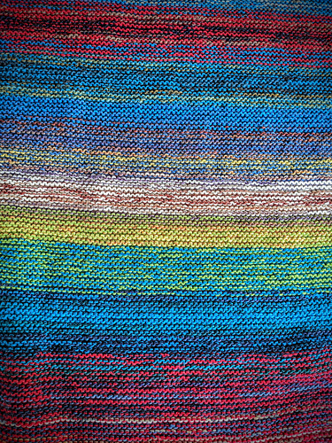 My second half of the year was not as productive, mainly because I worked in the aforementioned frogged sweaters. Still, I had time to work on a garter stitch blanket (afghan sized), my first triangular shawl and another sweater which I haven't yet finished (I still need to pick up the stitches for the collar and finish that). The blanket used all my left-over sock yarn, plus a bunch of colours I really didn't like. The good news is that, all mixed up, even these colours look pretty good in this blanket, as you can see.